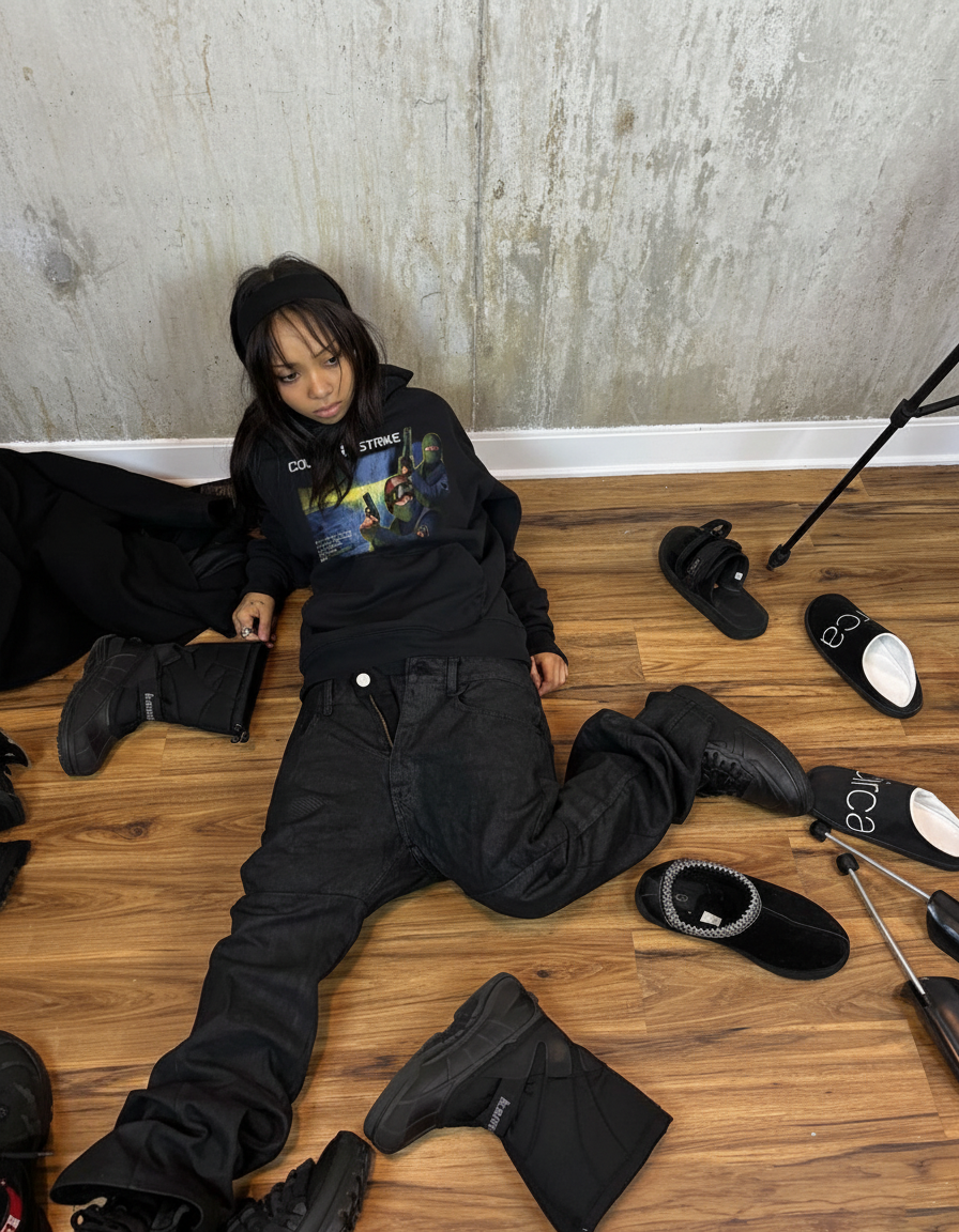The washed black finish gives it a worn-in, retro look, while the relaxed fit and ribbed details make it effortlessly comfortable. Perfect for fans of competitive shooters, e-sports culture, or anyone wanting that Y2K gaming aesthetic in their everyday wardrobe.